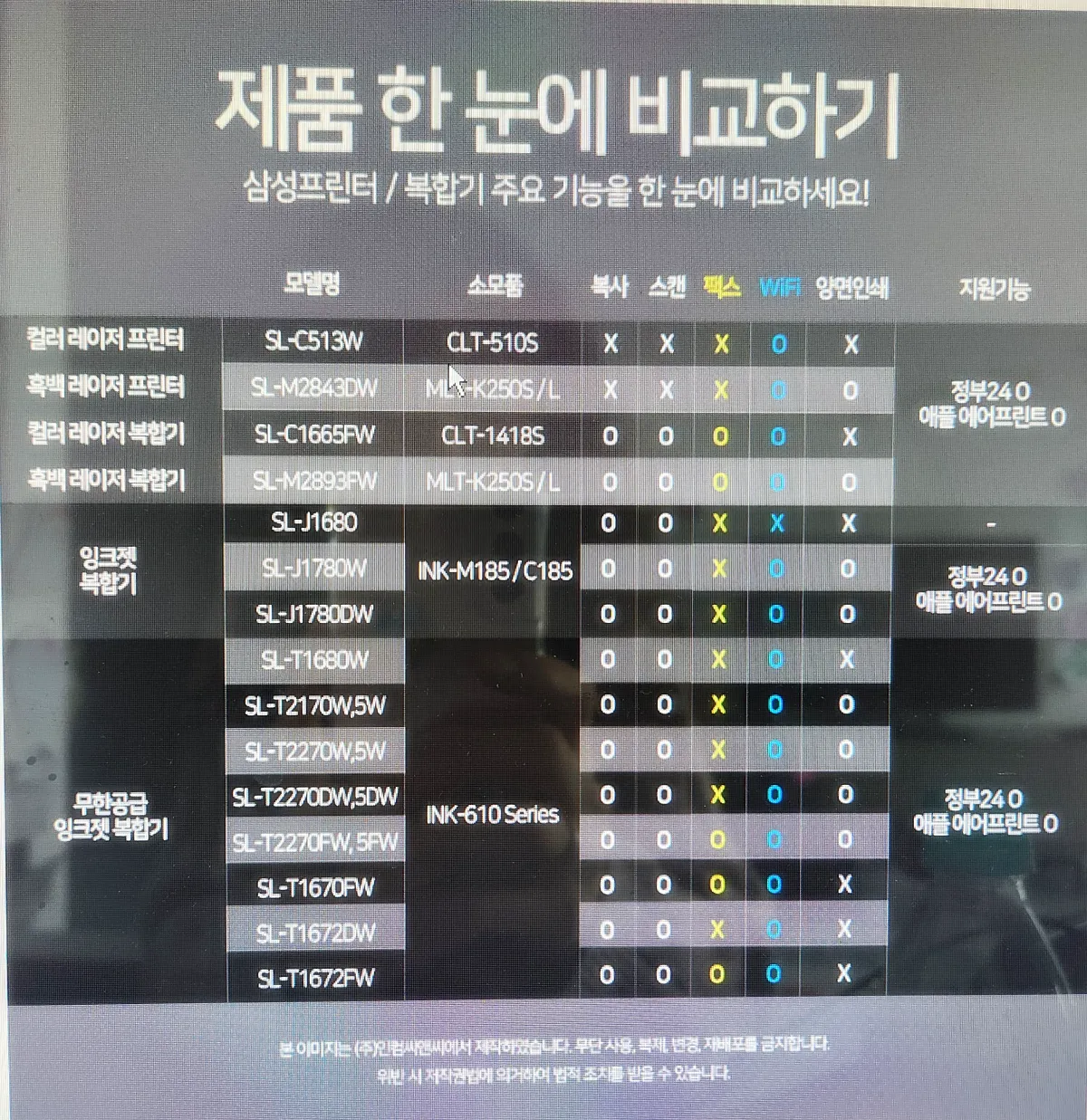 | 모델명 | 복사 | 스캔 | 팩스 | wifi | 양면인쇄 |