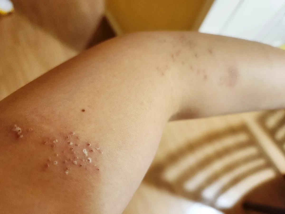 처음엔 피부가 빨갛게 부어올랐고 수포처럼 생기기 시작하다가 이제는 검은 점처럼 바뀌면서 딱지가 벗겨지는 거 같이 변했어요.