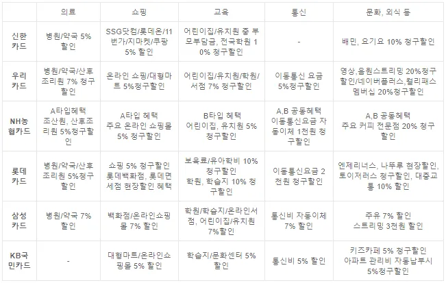 | 신한카드 | 어린이집/유치원 중 부모부담금, 전국 학원 10%청구할인 |